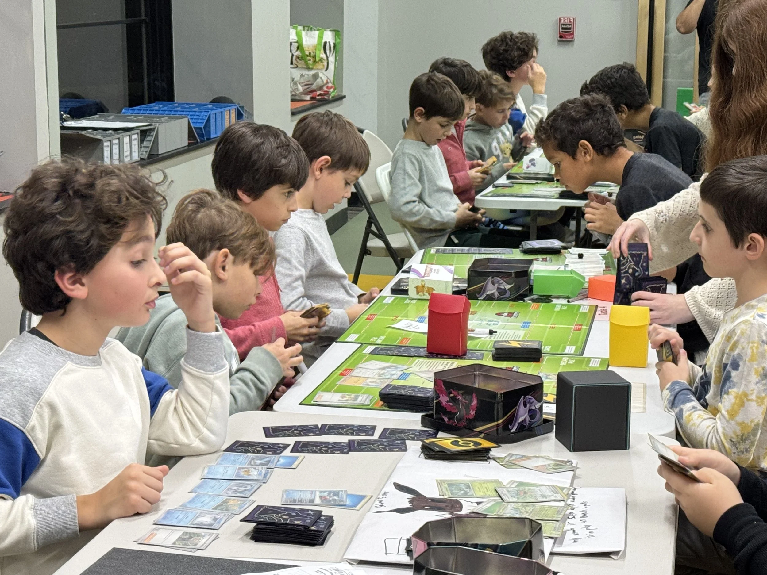 A group of children playing board games at tables in a gaming or recreational room with Black belts and punching bags in the background.