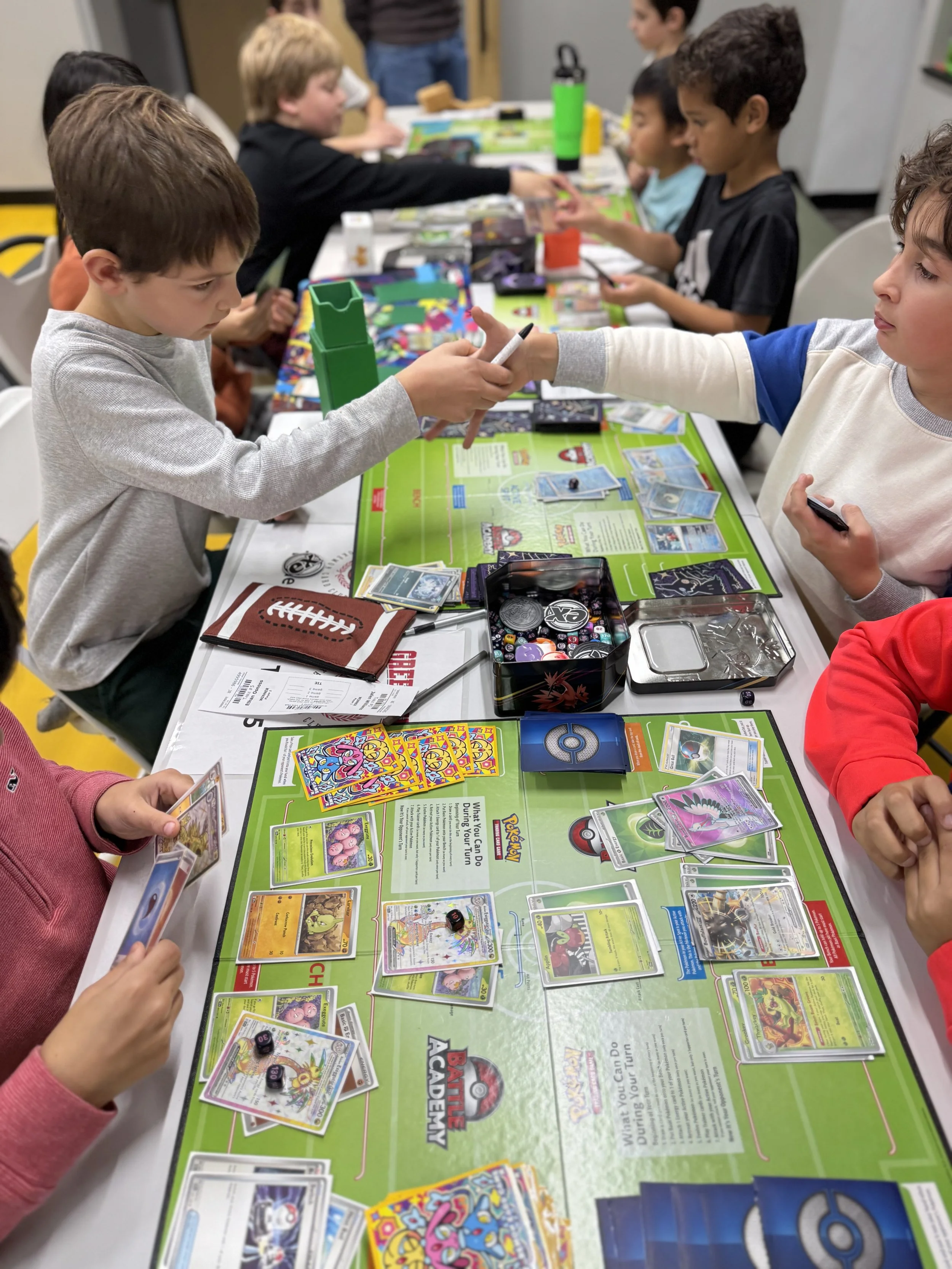 Two children playing a card game, likely Pokémon, at a table covered with Pokémon-themed cards and a game mat.